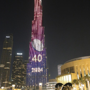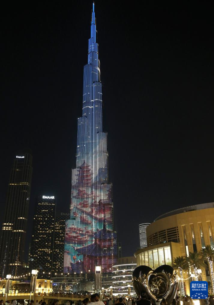 11月1日,阿联酋迪拜哈利法塔上演灯光秀,以“友谊四十载 未来更可期”为主题,展示中国与阿联酋建交40年来在科技、航天、文化、旅游等领域的友好合作。