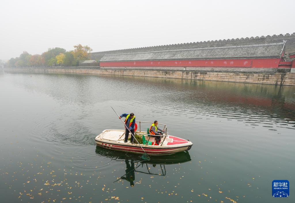 11月2日,工作人员清理北京故宫护城河上漂浮的落叶。