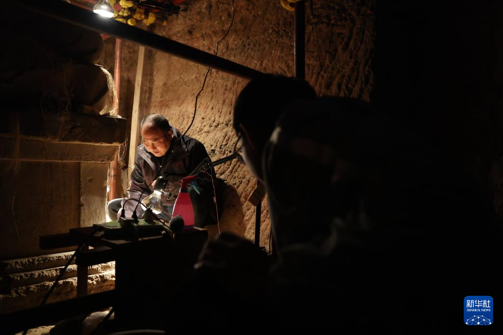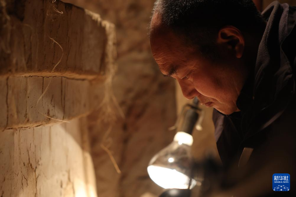 麦积山石窟艺术研究所文物修复人员杨志强在麦积山石窟32窟内进行保护修复工作(11月2日摄)。