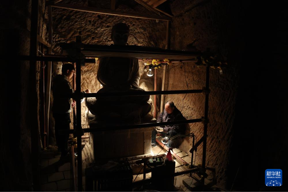 麦积山石窟艺术研究所保护研究室文物修复师牟常有(右)和何举在麦积山石窟133窟内修复塑像(11月2日摄)。