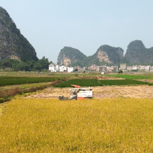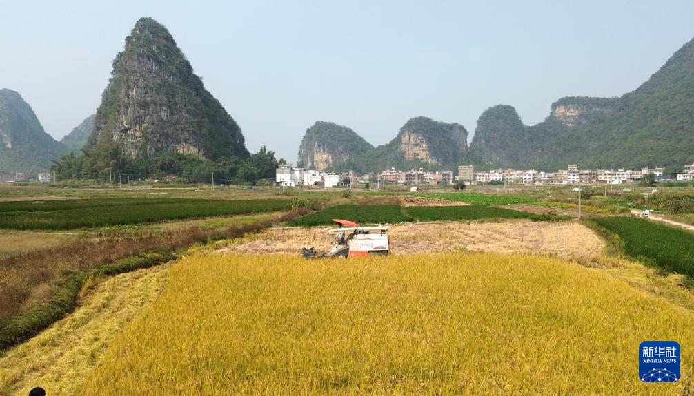 11月2日,在广西贺州市平桂区鹅塘镇栗木村,农机手驾驶收割机收割稻谷(无人机照片)。