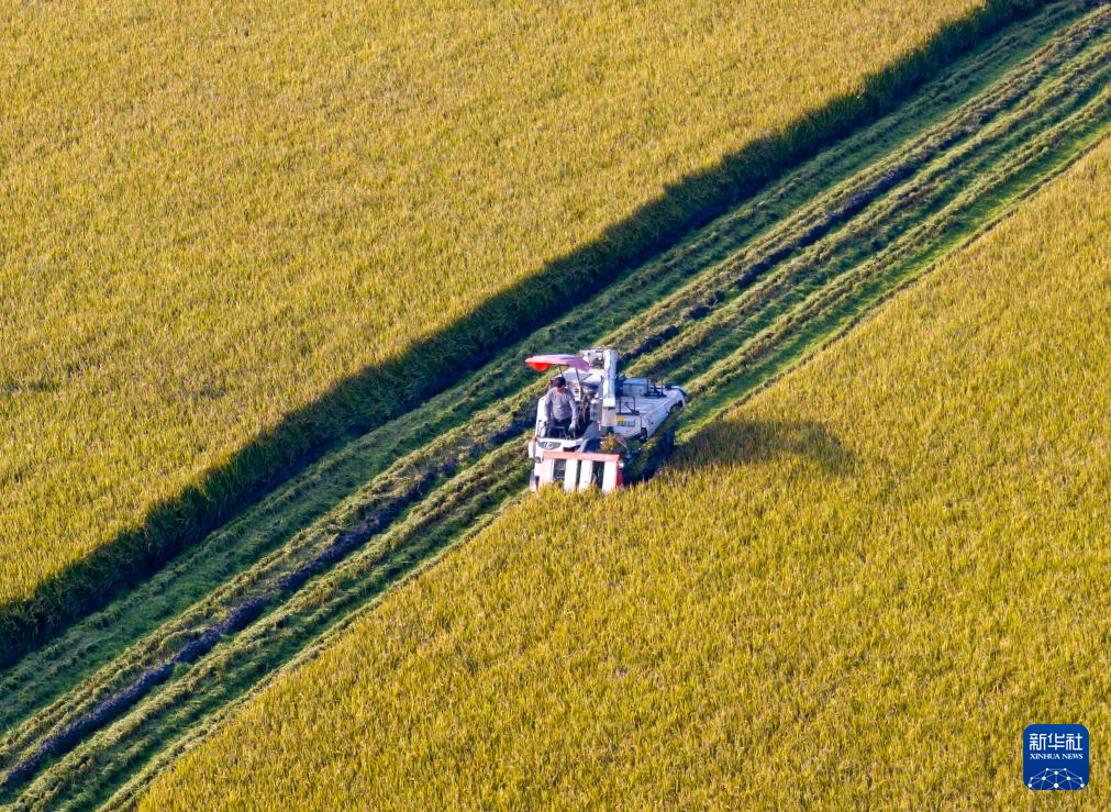 11月3日,在河南省南阳市官庄镇高效农业示范田,农机手驾驶收割机在水稻田收获稻谷(无人机照片)。