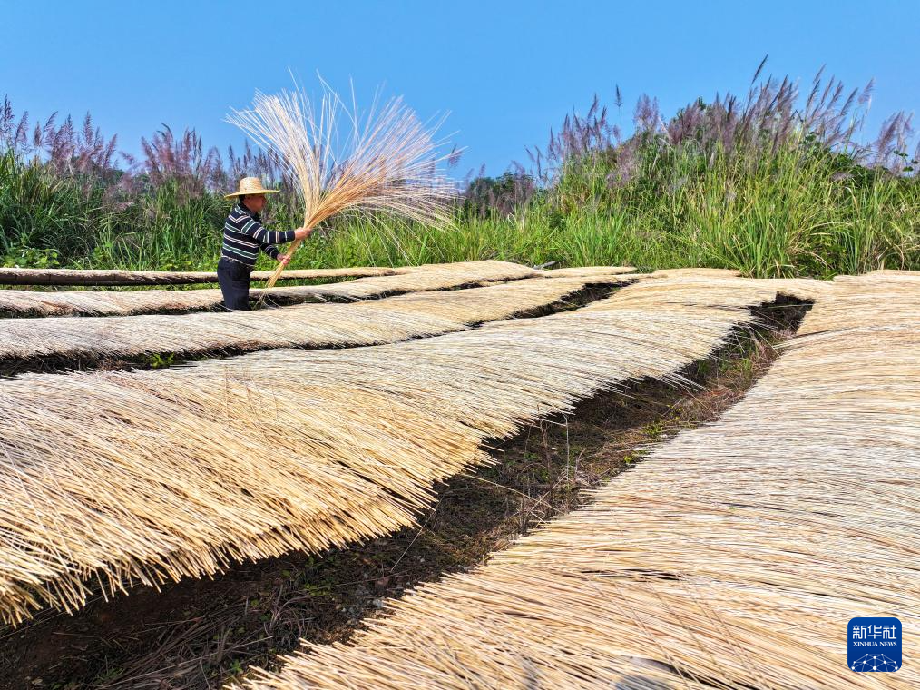 11月3日,湖南省常宁市三角塘镇七坪村村民在晾晒竹条(无人机照片)。