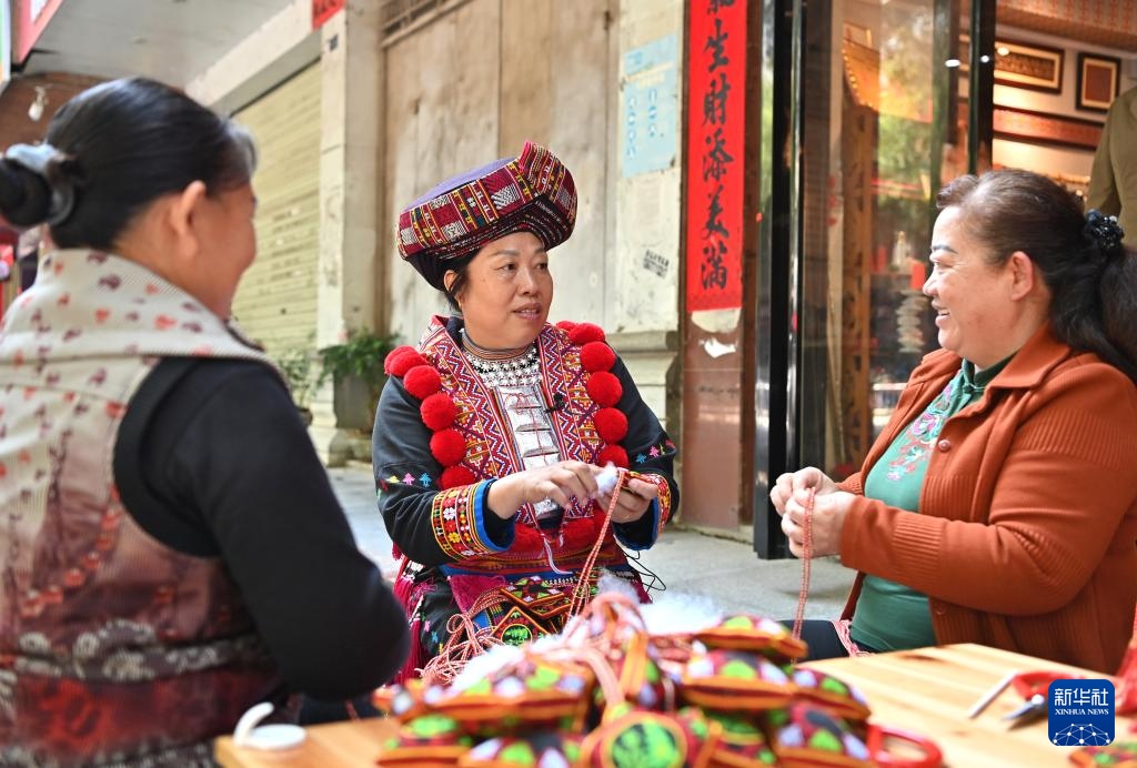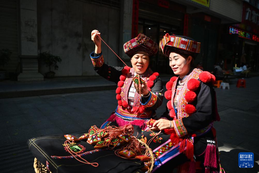 盘海燕(左)在广西百色市田林县自己开办的绣坊前给徒弟演示针法(10月31日摄)。