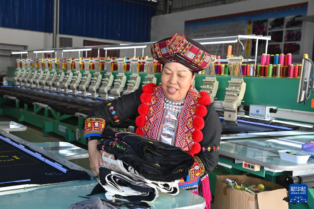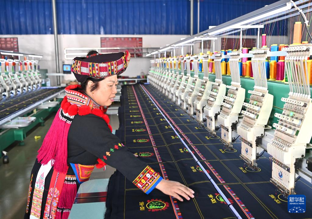 盘海燕在广西百色市田林县绣厂里检查机织绣品质量(10月31日摄)。