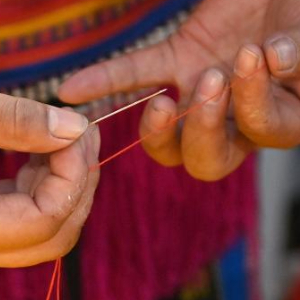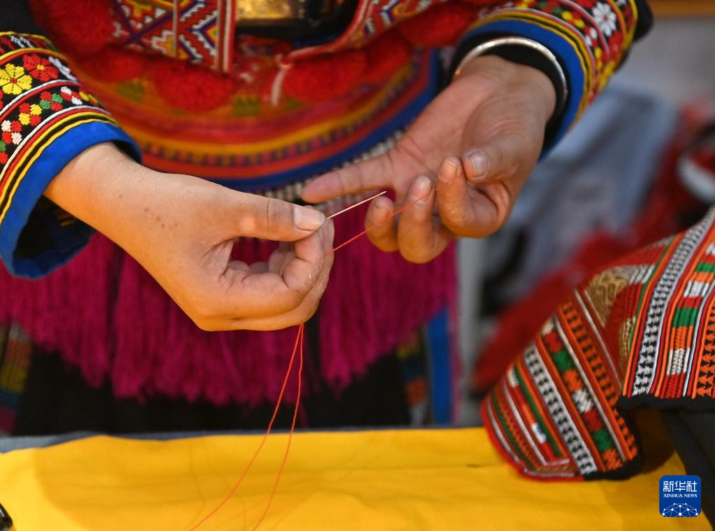 盘海燕在广西百色市田林县自己开办的绣坊里穿针(10月31日摄)。
