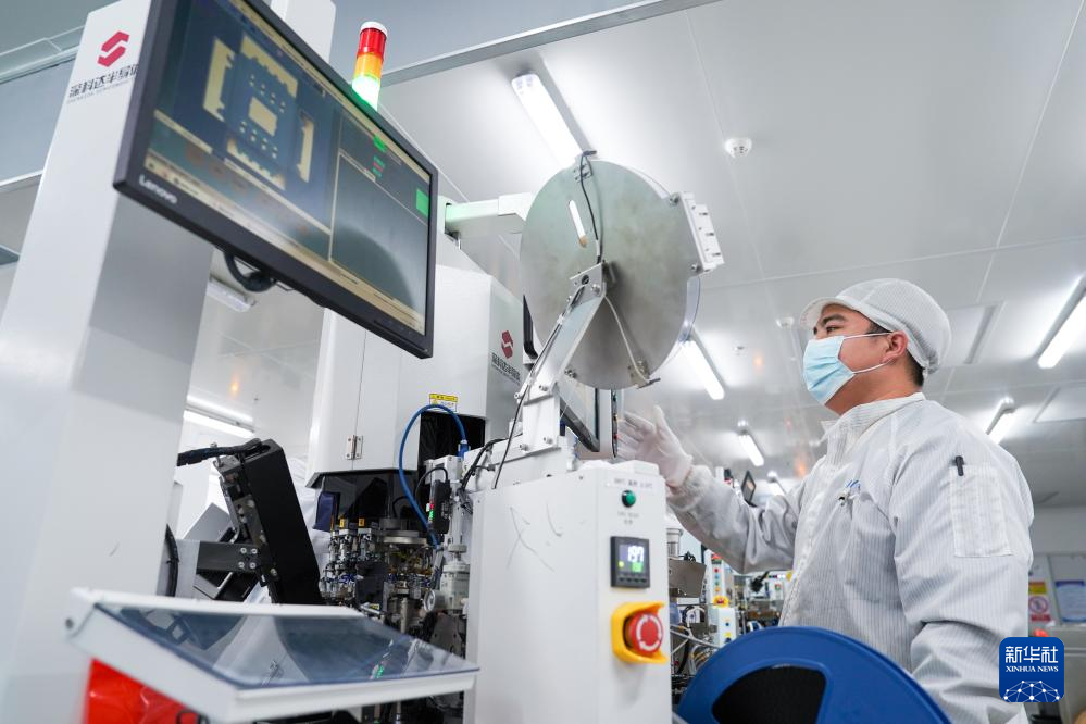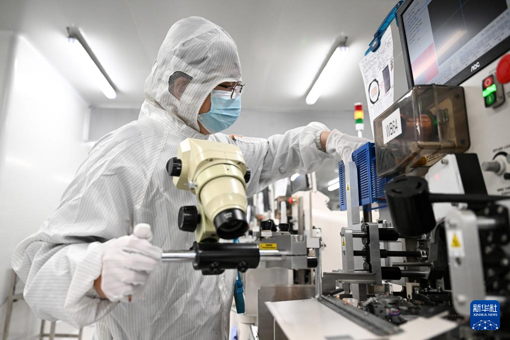 在位于江苏南通如东经济开发区的南通宁芯微电子有限公司,工作人员在装片焊线车间内作业(11月2日摄)。