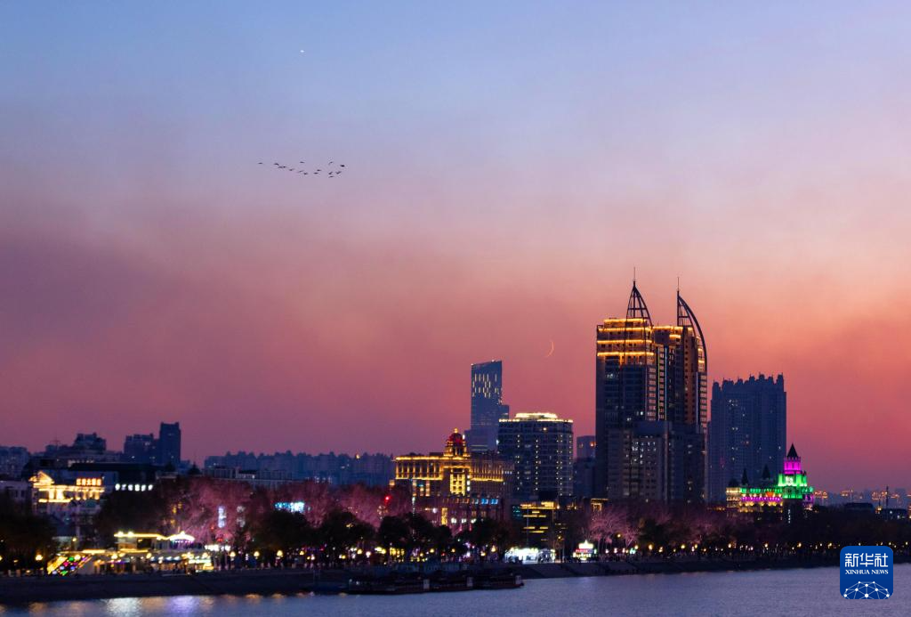 11月4日,在黑龙江省哈尔滨市,鸟群从金星和蛾眉月之间飞过。