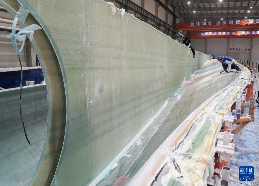 工作人员在重通成飞风电设备江苏有限公司车间内作业(11月2日摄)。