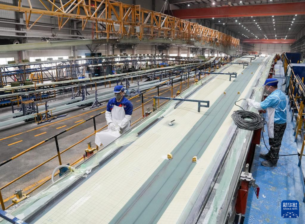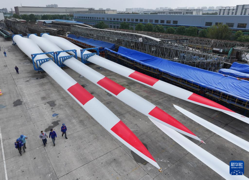 这是11月2日在重通成飞风电设备江苏有限公司拍摄的风力发电机组叶片(无人机照片)。