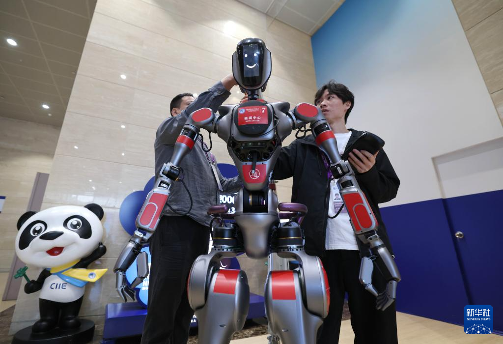 11月4日,工作人员在中国国际进口博览会新闻中心调试机器人“小新”。