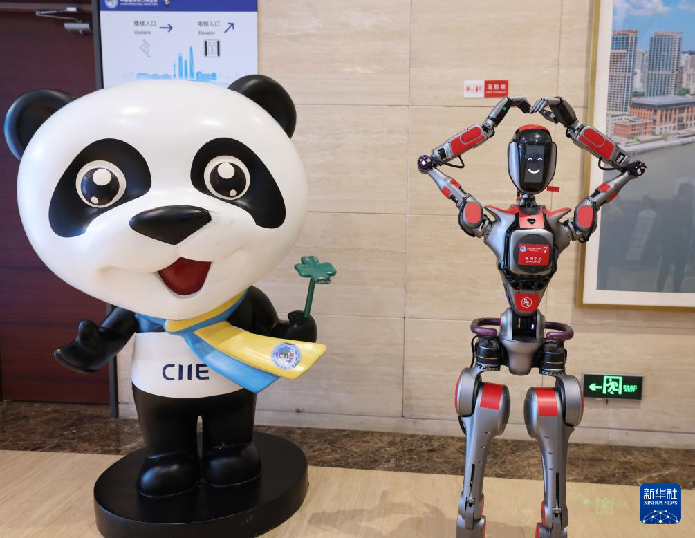 11月4日,新闻中心的机器人“小新”和中国国际进口博览会吉祥物“进宝”在欢迎记者。