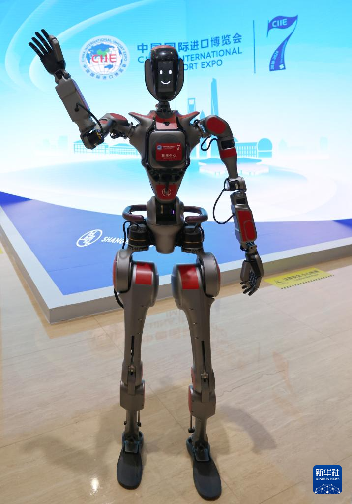 11月4日,中国国际进口博览会新闻中心的机器人“小新”在欢迎记者。