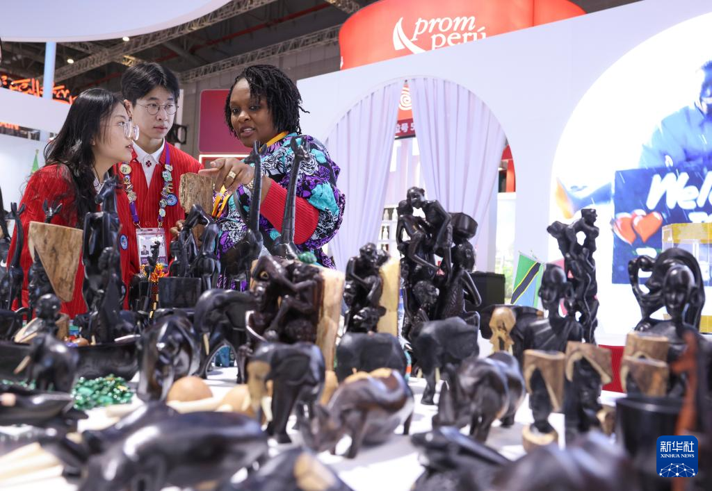 11月5日,志愿者在坦桑尼亚馆了解展出的工艺品。