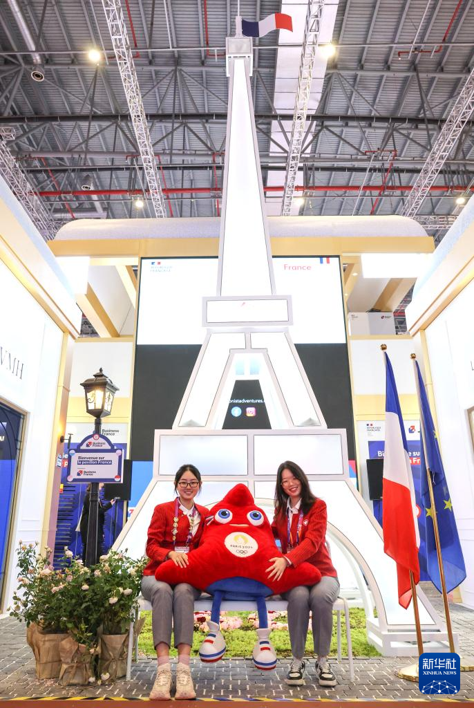 11月5日,志愿者在法国馆与巴黎奥运会吉祥物合影。