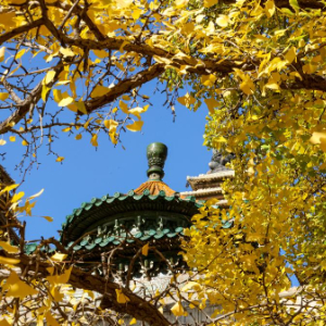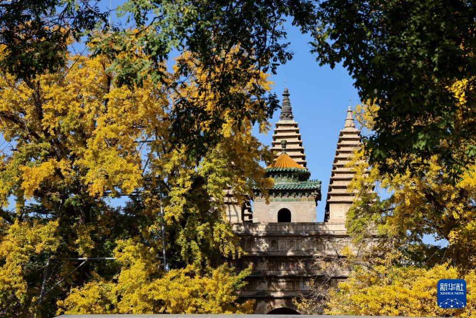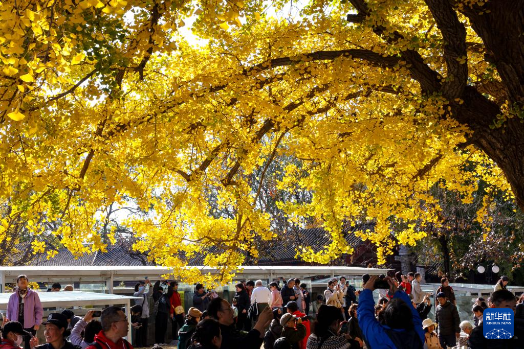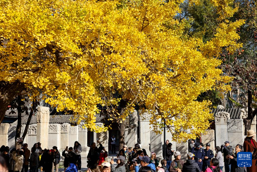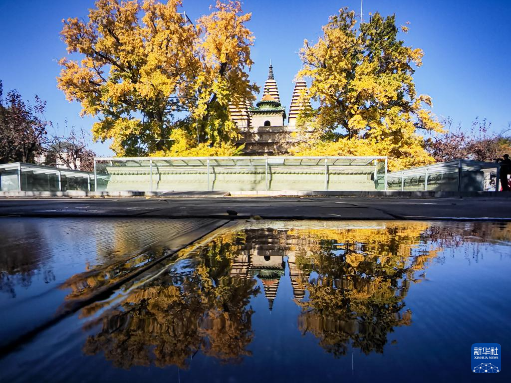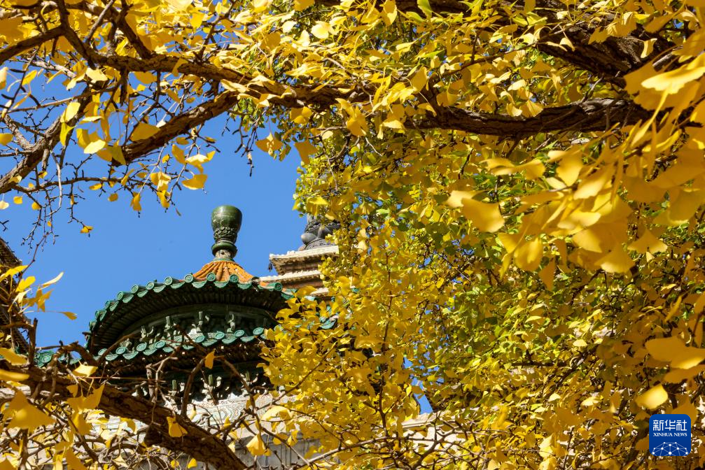 晚秋时节,北京五塔寺院内银杏尽黄,吸引许多市民、游客赏秋游园。