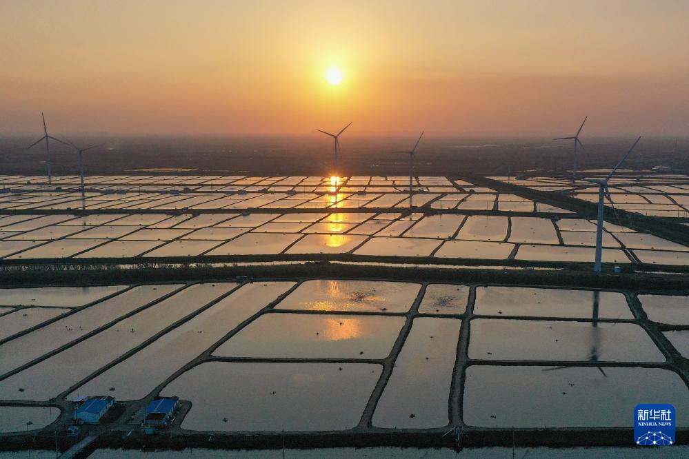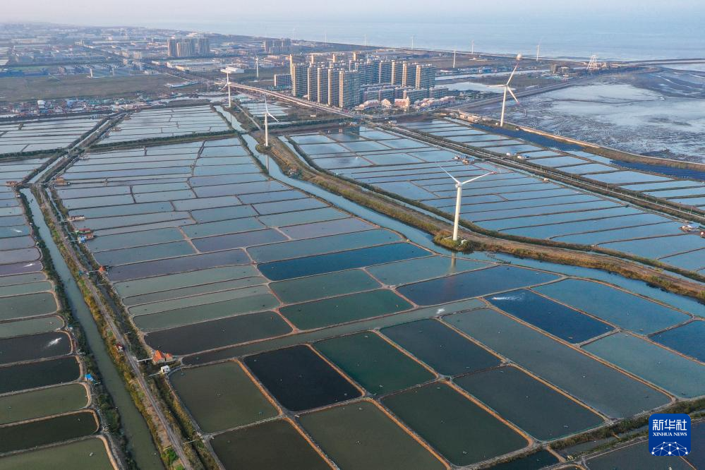 这是11月3日拍摄的启东沿海万亩虾蟹养殖基地,犹如放置在海边的巨大调色盘(无人机照片)。