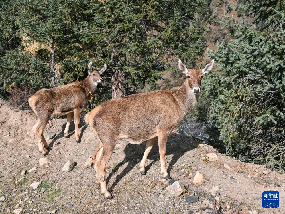 这是11月4日在多瀑沟景区拍摄的2只国家一级保护动物白唇鹿。