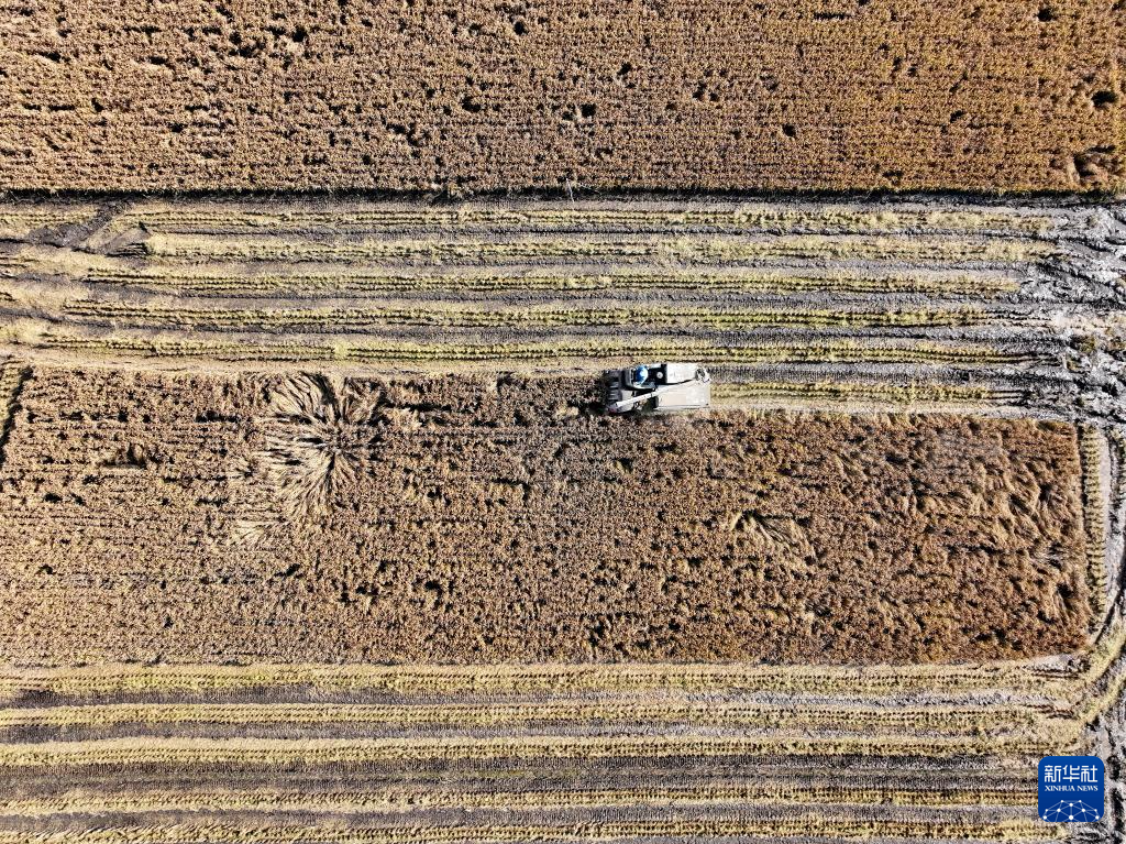 11月6日,涿州金穗农业种植专业合作社的农机在涿州市百尺竿镇西豆家庄村稻田里收获水稻(无人机照片)。