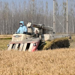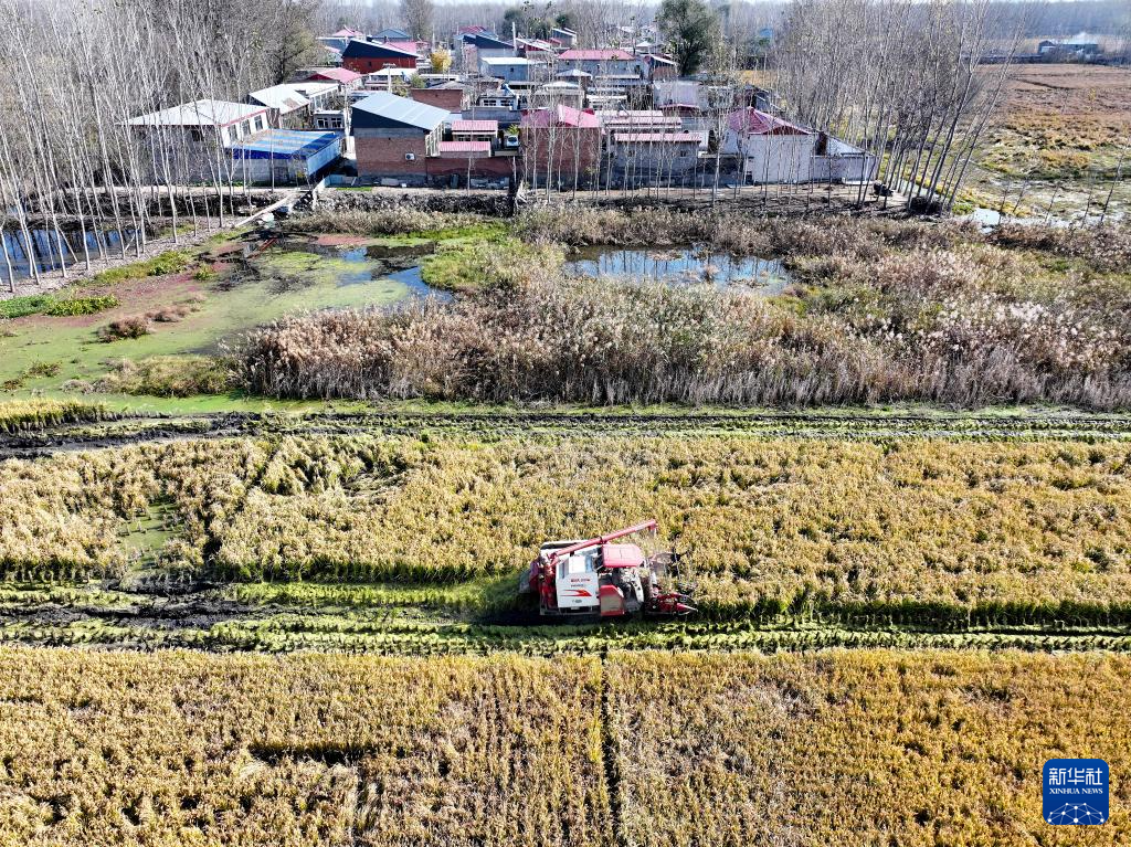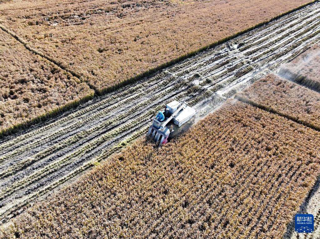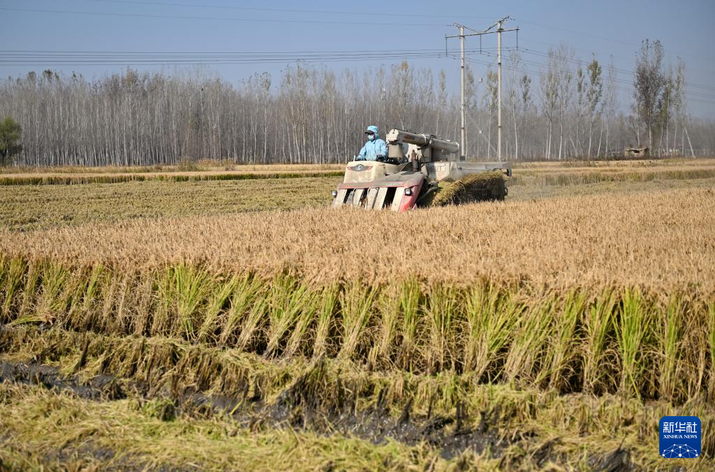 时下,河北省涿州市上万亩水稻迎来丰收季,当地农民抢抓晴好天气收获水稻,确保颗粒归仓。