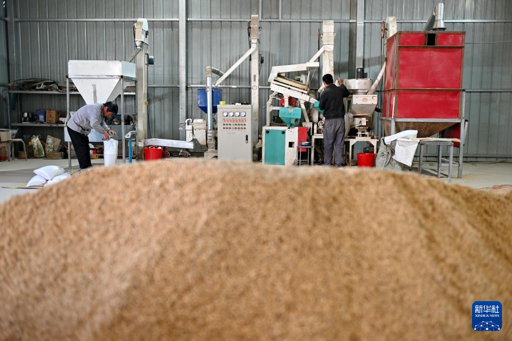 11月6日,涿州市蟹米花田家庭农场的农民在加工收获的水稻。