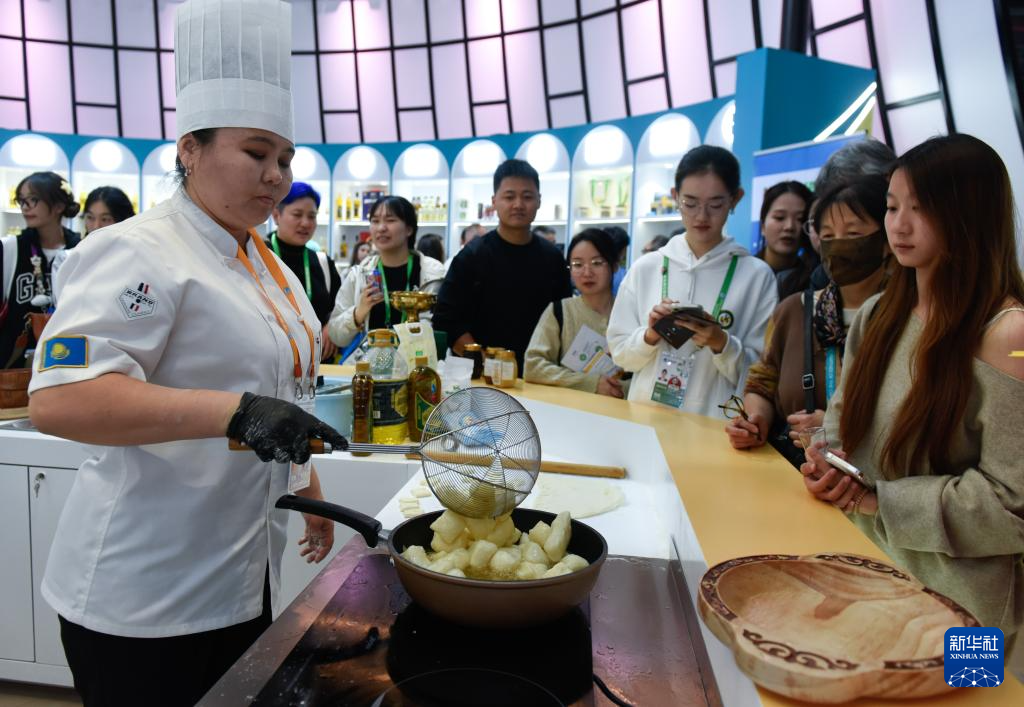11月6日,参会者在第七届进博会食品及农产品展区哈萨克斯坦商品馆等待品尝使用哈萨克斯坦面粉和食用油炸制的小吃。