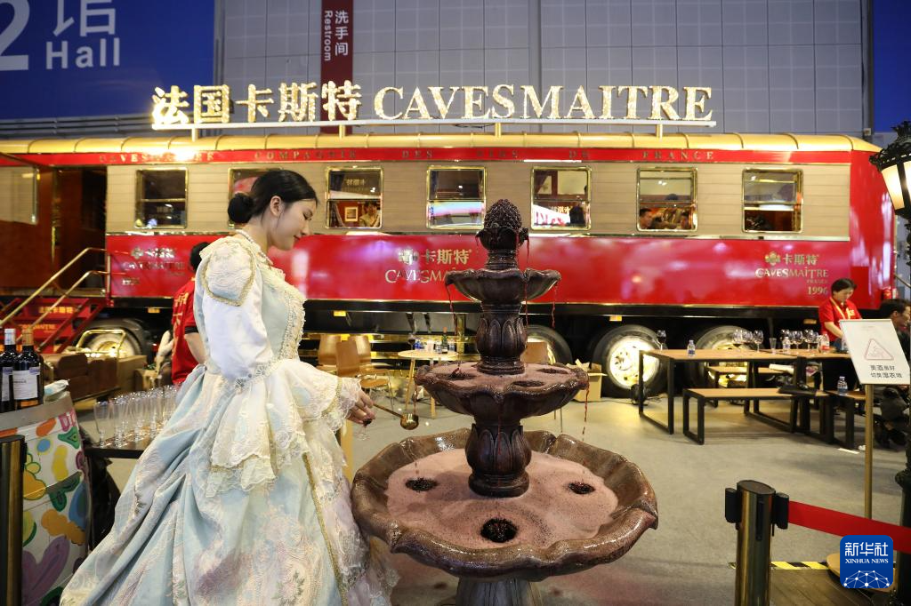 11月6日,在第七届进博会食品及农产品展区,一家红酒展商的工作人员为观众准备试饮的红酒。
