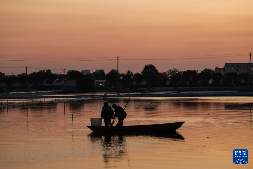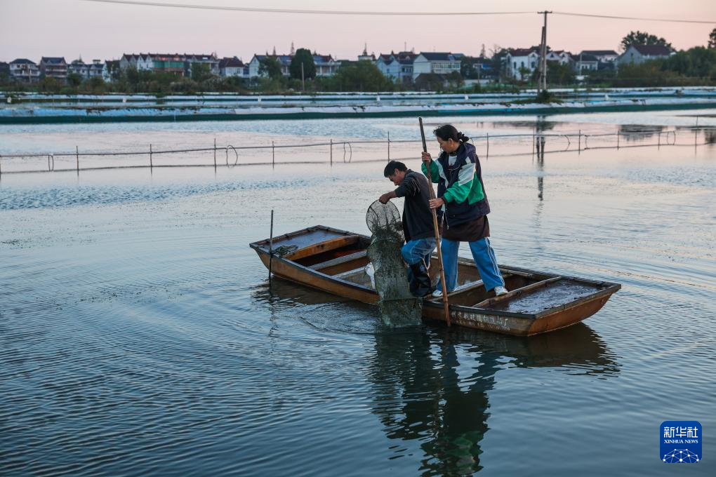 11月6日清晨,湖州吴兴高新区东桥村金森蟹业养殖基地的蟹农撑着船捕捞太湖蟹。