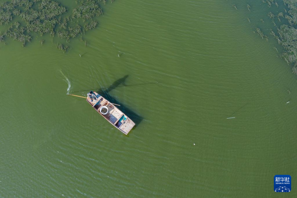 11月5日,在位于湖州吴兴高新区的杨桂珍螃蟹养殖基地,养殖户在蟹塘捕捞太湖蟹(无人机照片)。