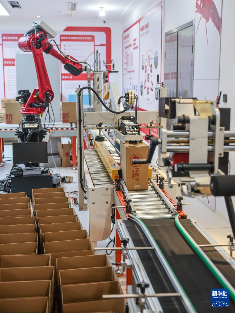 这是11月5日在位于湖州吴兴高新区的杨桂珍螃蟹养殖基地拍摄的自动化包装流水线。