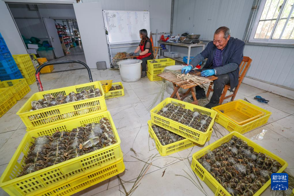 11月5日,在位于湖州吴兴高新区的杨桂珍螃蟹养殖基地,养殖户手工捆扎太湖蟹。