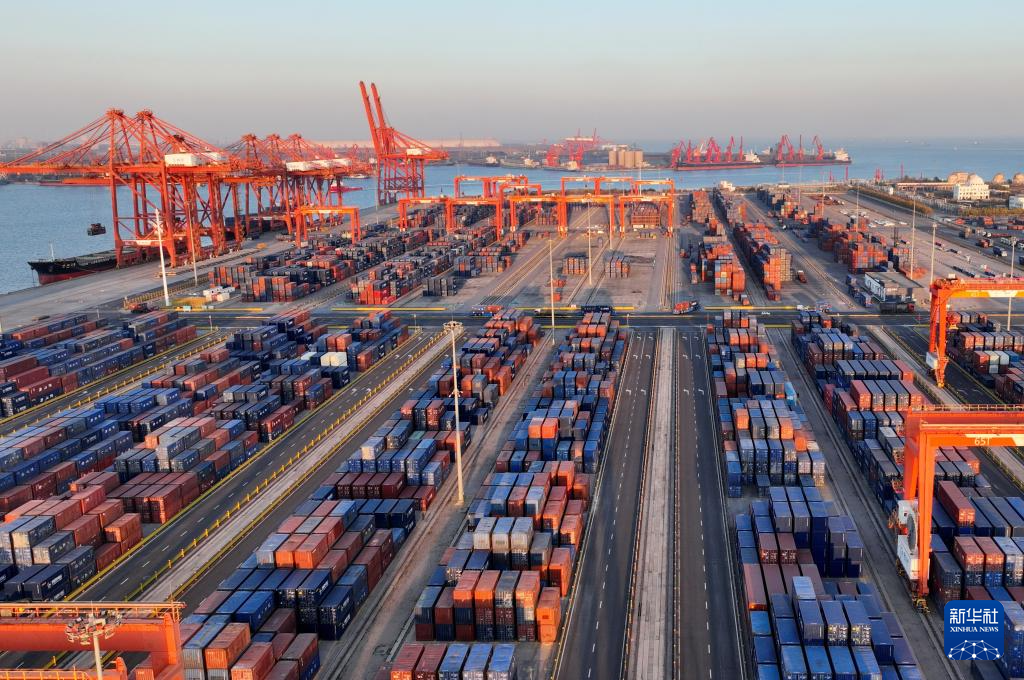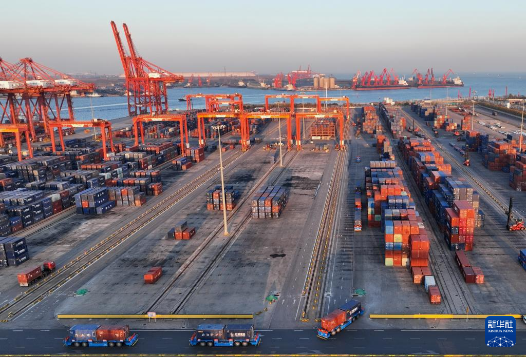 11月5日拍摄的唐山港京唐港区集装箱码头堆场(无人机照片)。
