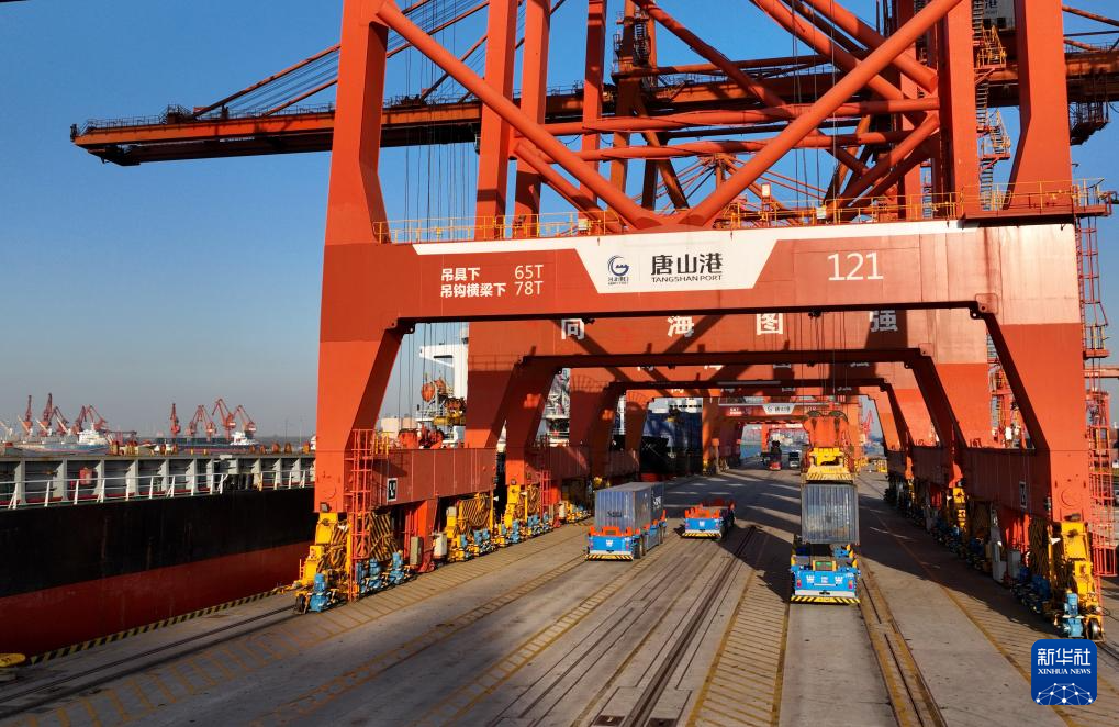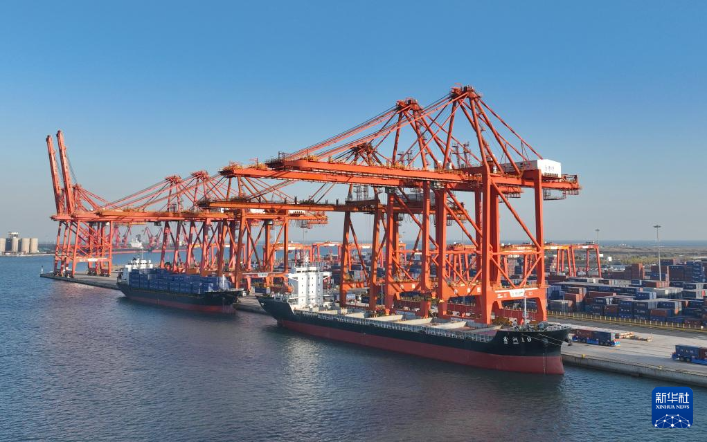 11月5日,轮船靠泊在唐山港京唐港区集装箱码头装货(无人机照片)。
