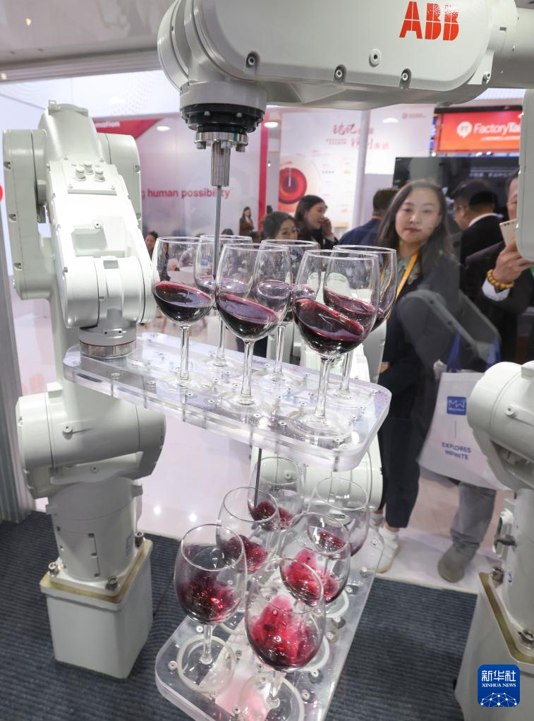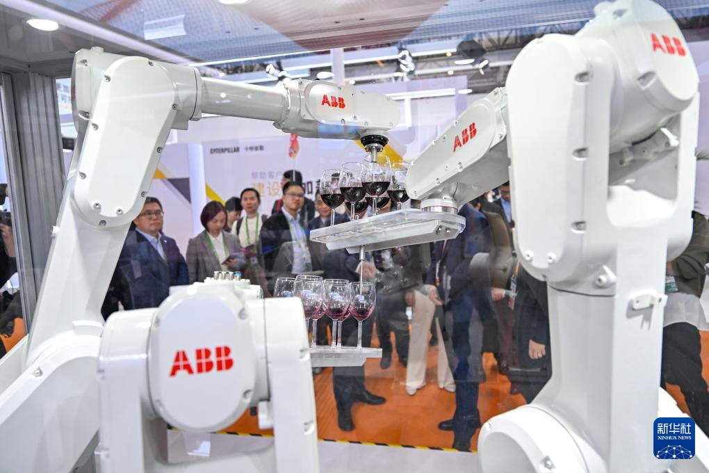 11月6日,在第七届进博会的技术装备展区ABB集团展台,一款控制柜主机单元控制多台机器人同时运动。