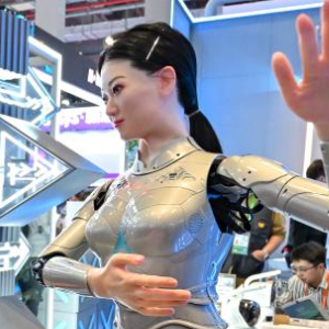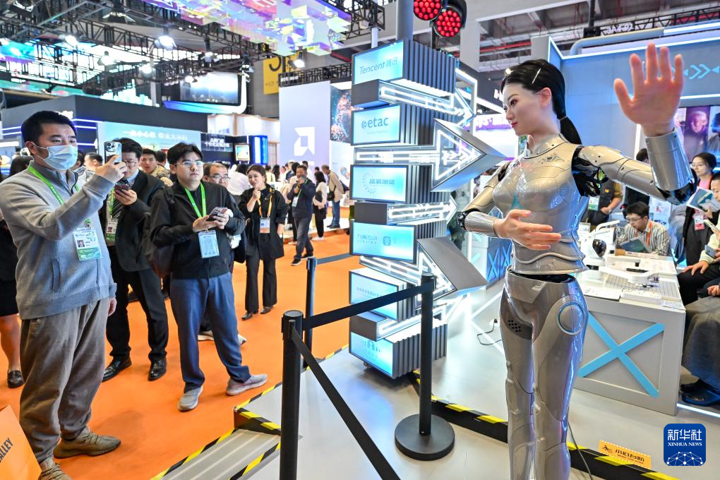 11月6日,观众在第七届进博会技术装备展区观看一款人型机器人跳舞。