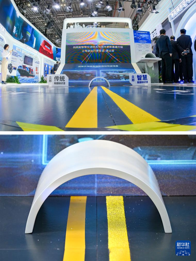 这是11月6日在第七届进博会技术装备展区新材料专区立邦展台拍摄的智慧路面标识漆与传统路面标识漆的对比场景(拼版照片)。