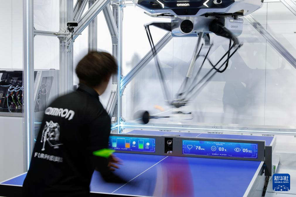 11月6日,在第七届进博会技术装备展区,工作人员在与欧姆龙乒乓球教练机器人互动中回球。