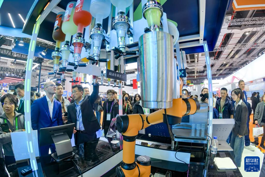 这是11月6日在第七届进博会技术装备展区西门子展台拍摄的AI迷你调酒工厂。