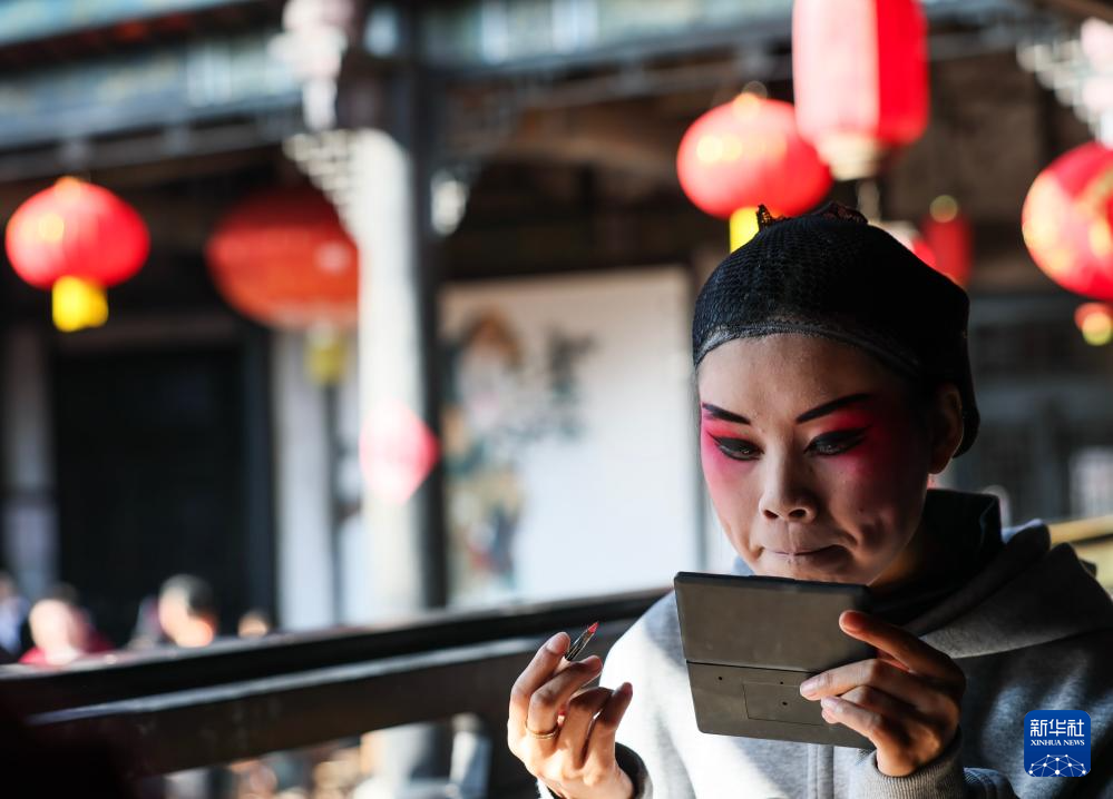 11月5日,川剧演员在恩阳古镇里化妆,准备演出。