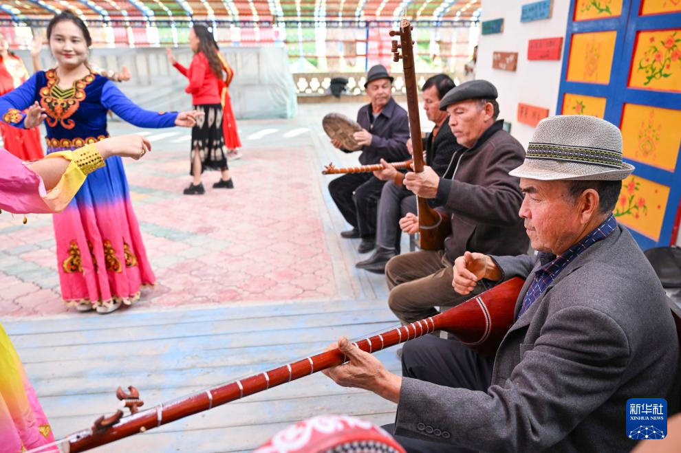 在加依村的一处小院,努尔东·司马义(右一)和几位村民弹奏乐曲,人们踏着节拍欢快起舞(10月30日摄)。