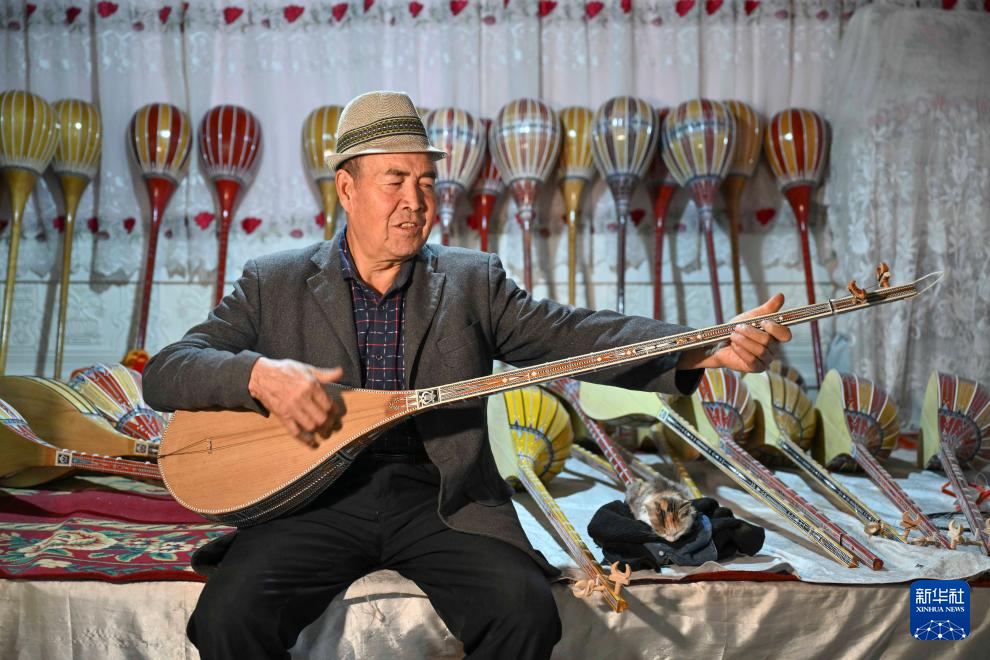 阳光洒进一个周围栽满桑树的小院,院中葡萄架下,光影斑驳。65岁的努尔东·司马义在家中忙碌,带着家人和徒弟手工制作传统乐器。