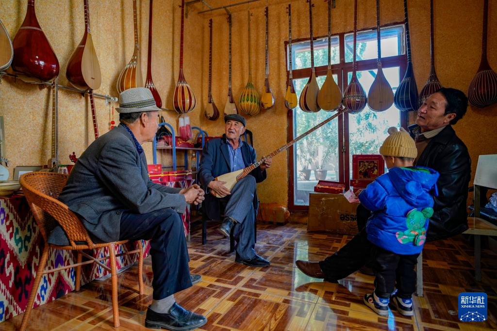 邻县的民间艺人(中)和朋友来到努尔东·司马义家中选购乐器,他们就弹布尔的声音进行交流(10月29日摄)。