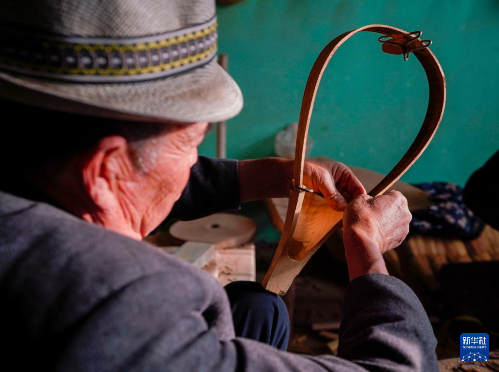 努尔东·司马义在家中制作都塔尔的琴箱框架(10月29日摄)。