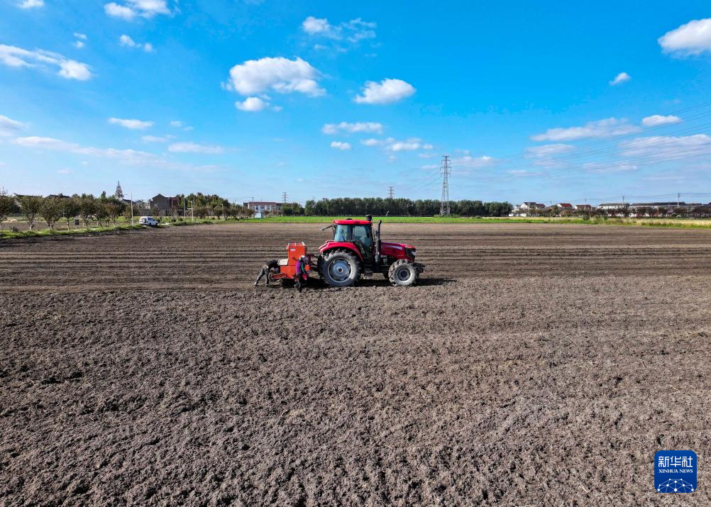 11月7日,在江苏省泰兴市滨江镇联杨村,农机手驾驶大型播种机在田间播种小麦(无人机照片)。