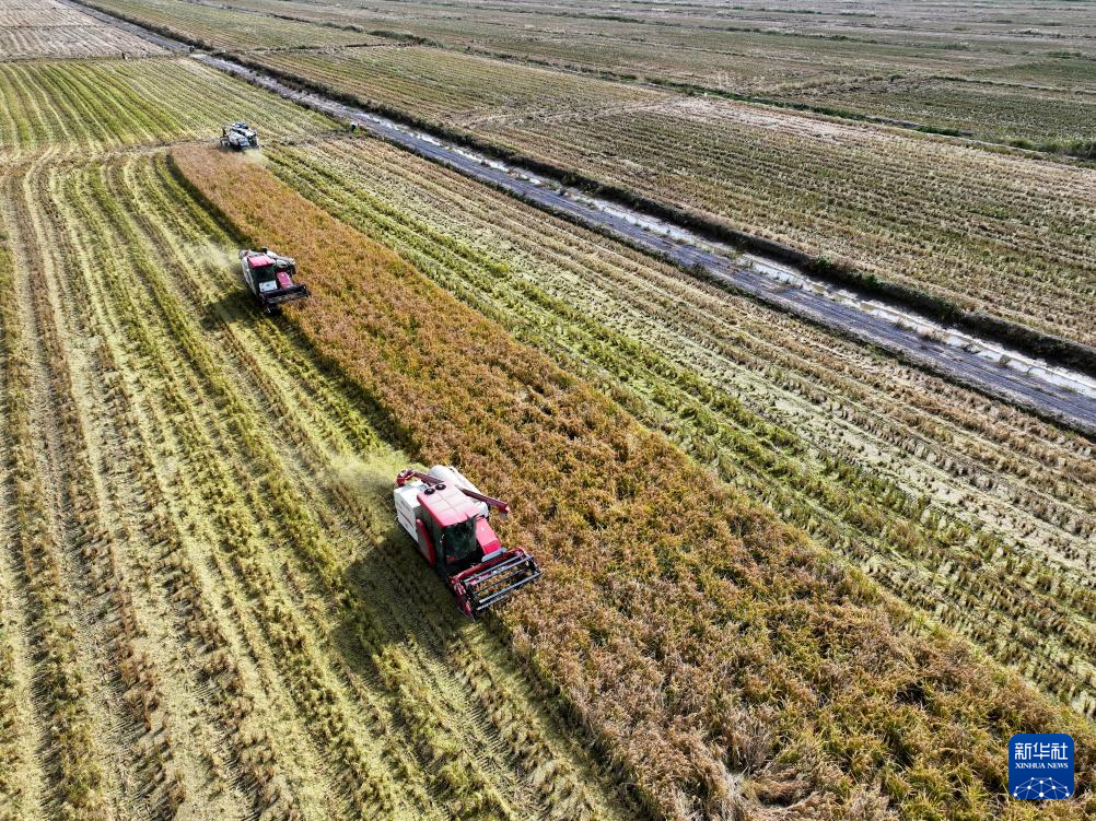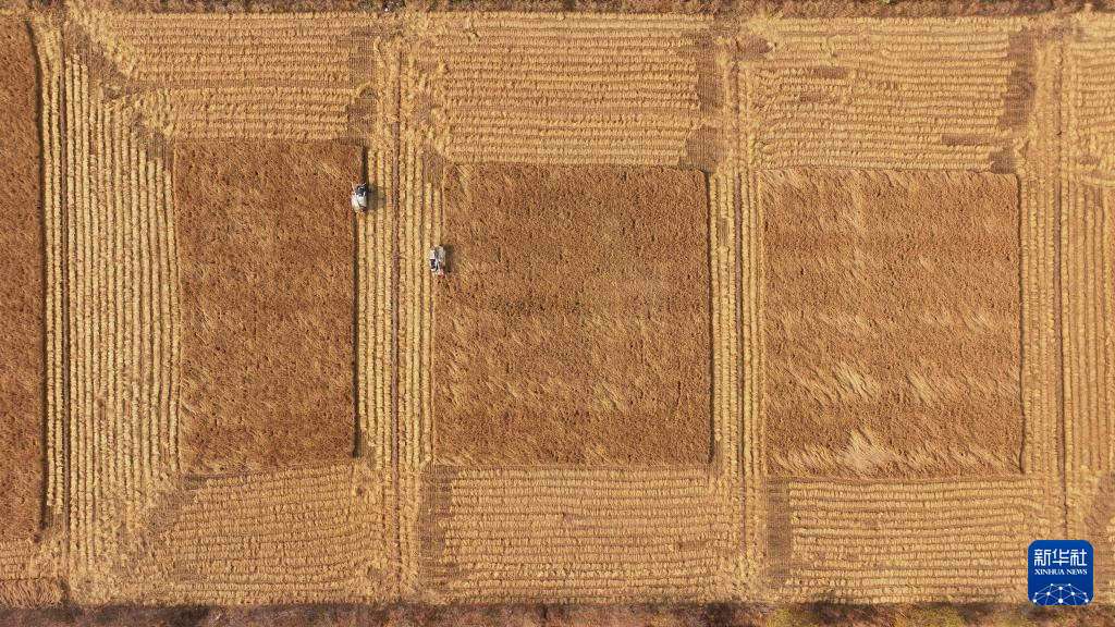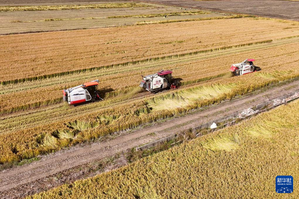 11月7日,在河北唐山芦台经济开发区四分场,农民在驾驶收割机收割水稻(无人机照片)。
