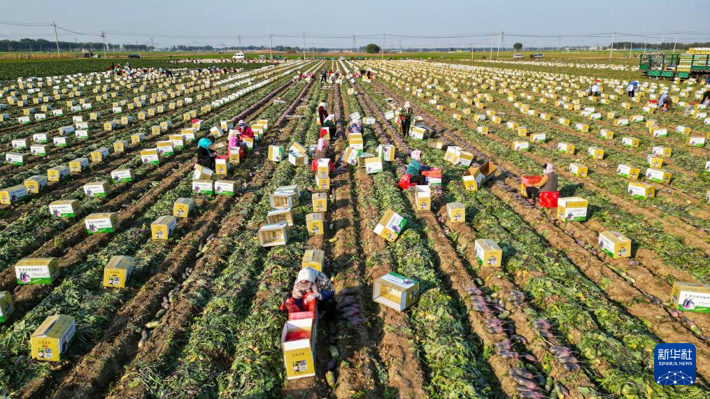 11月7日,在山东省东营市广饶县李鹊镇郝家村的农田里,农民在收获萝卜(无人机照片)。