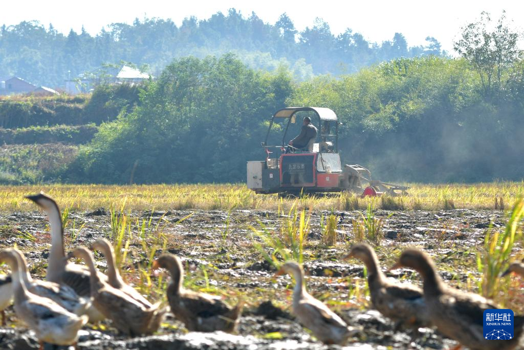 11月7日,在湖南省娄底市双峰县井字镇生机村,农民驾驶农机耕整田地。