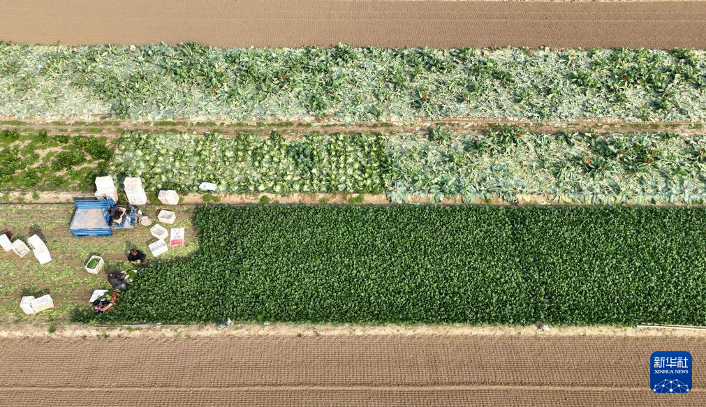 11月7日,在河北省唐山市丰润区七树庄镇小李庄村,菜农在田里收获白菜(无人机照片)。