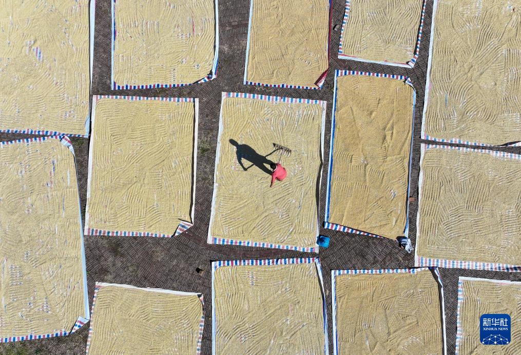 11月7日,湖南省永州市江永县兰溪瑶族乡的农民在晾晒稻谷(无人机照片)。