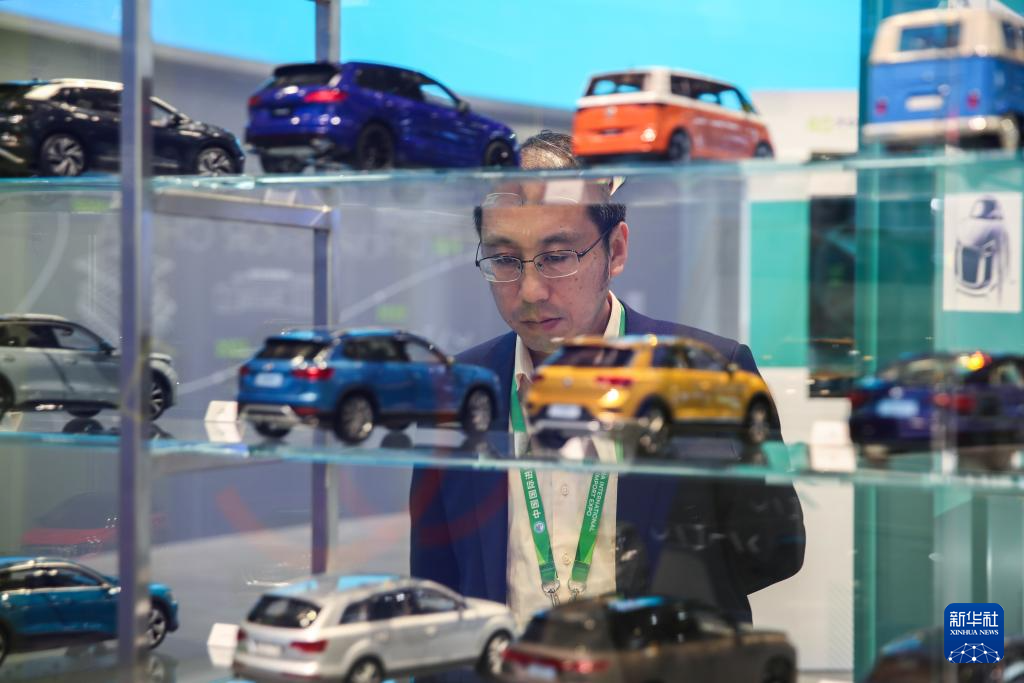 11月7日,观众在第七届进博会汽车展区观看大众汽车模型。